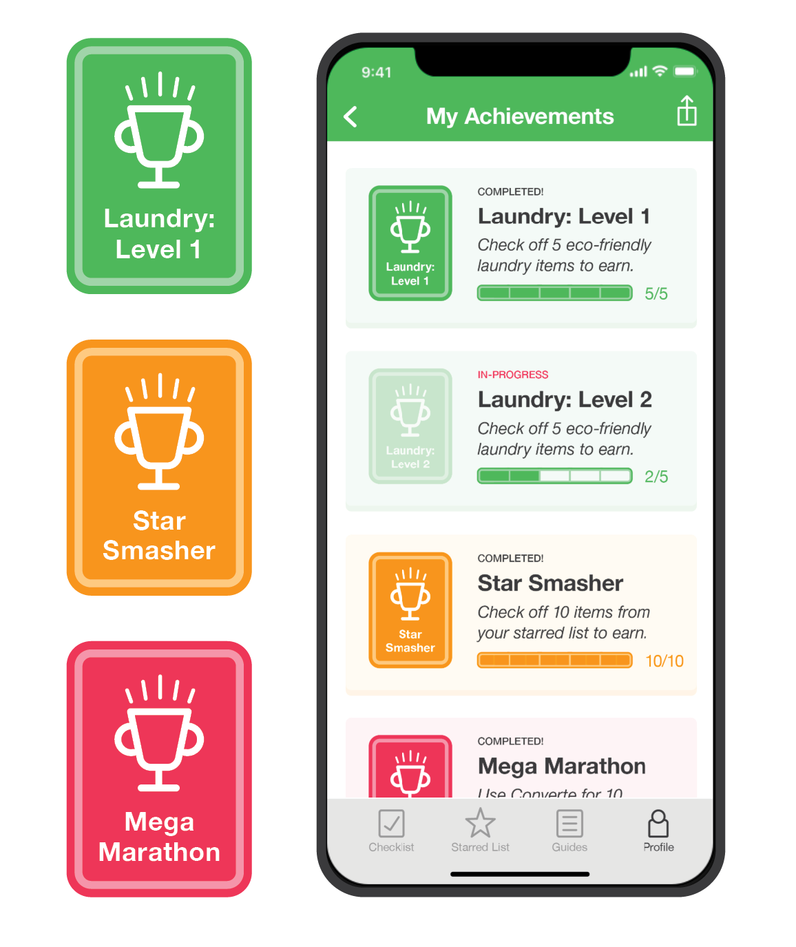 3. Guides: These let users easily browse, star, check off, share, and learn about eco-friendly tasks. Guides are categorized according to common household needs.